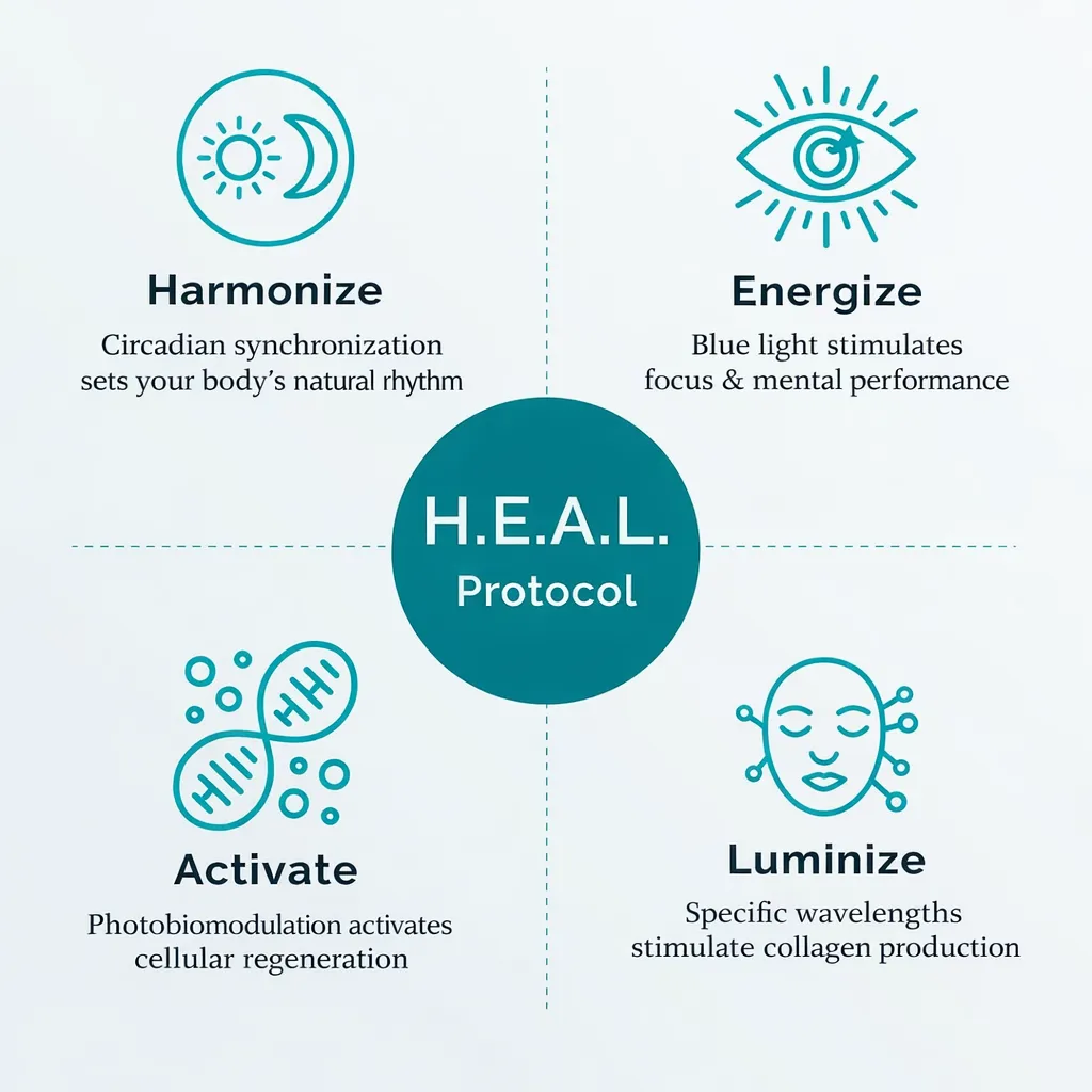 H.E.A.L. Protocol™ is a scientifically inspired lighting system that combines two powerful principles: circadian light synchronisation and photobiomodulation.